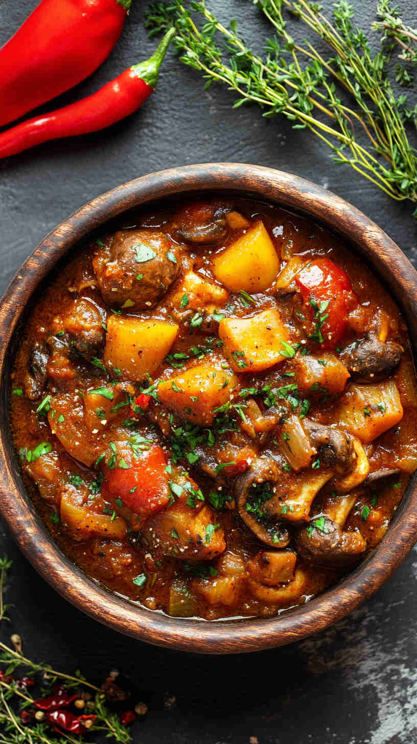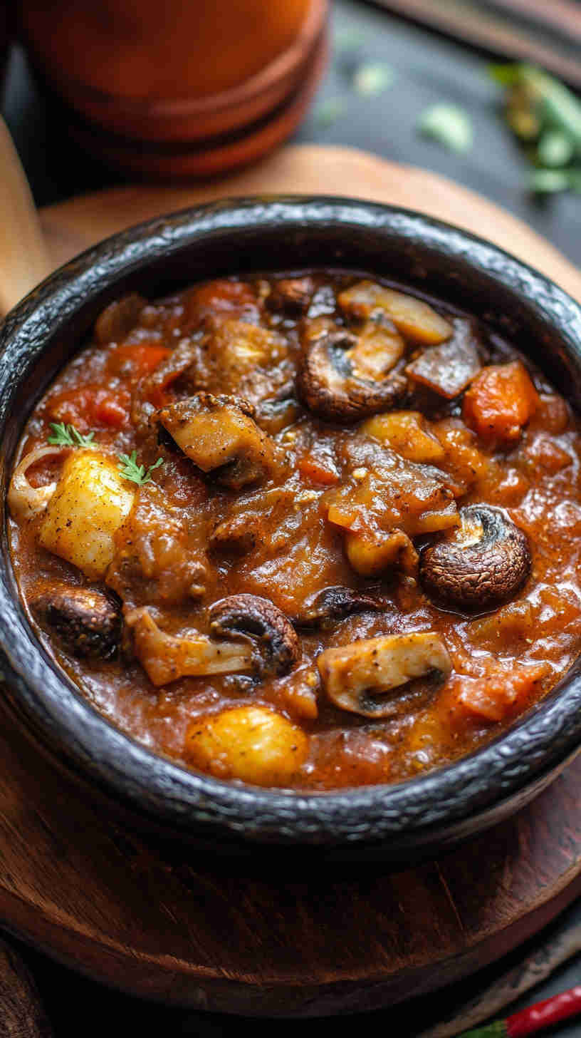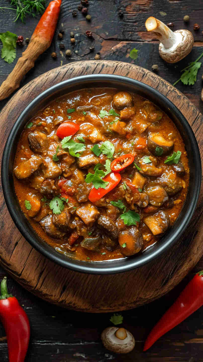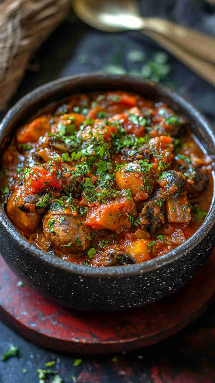 Fiery, hearty Ghanaian spicy mushroom stew with tomatoes, ginger, and Scotch bonnet—vegan comfort packed with bold African flavors.