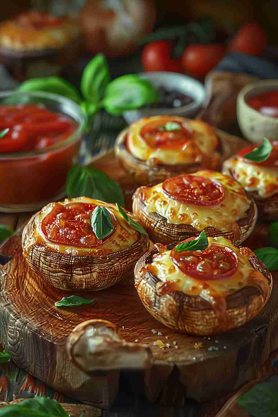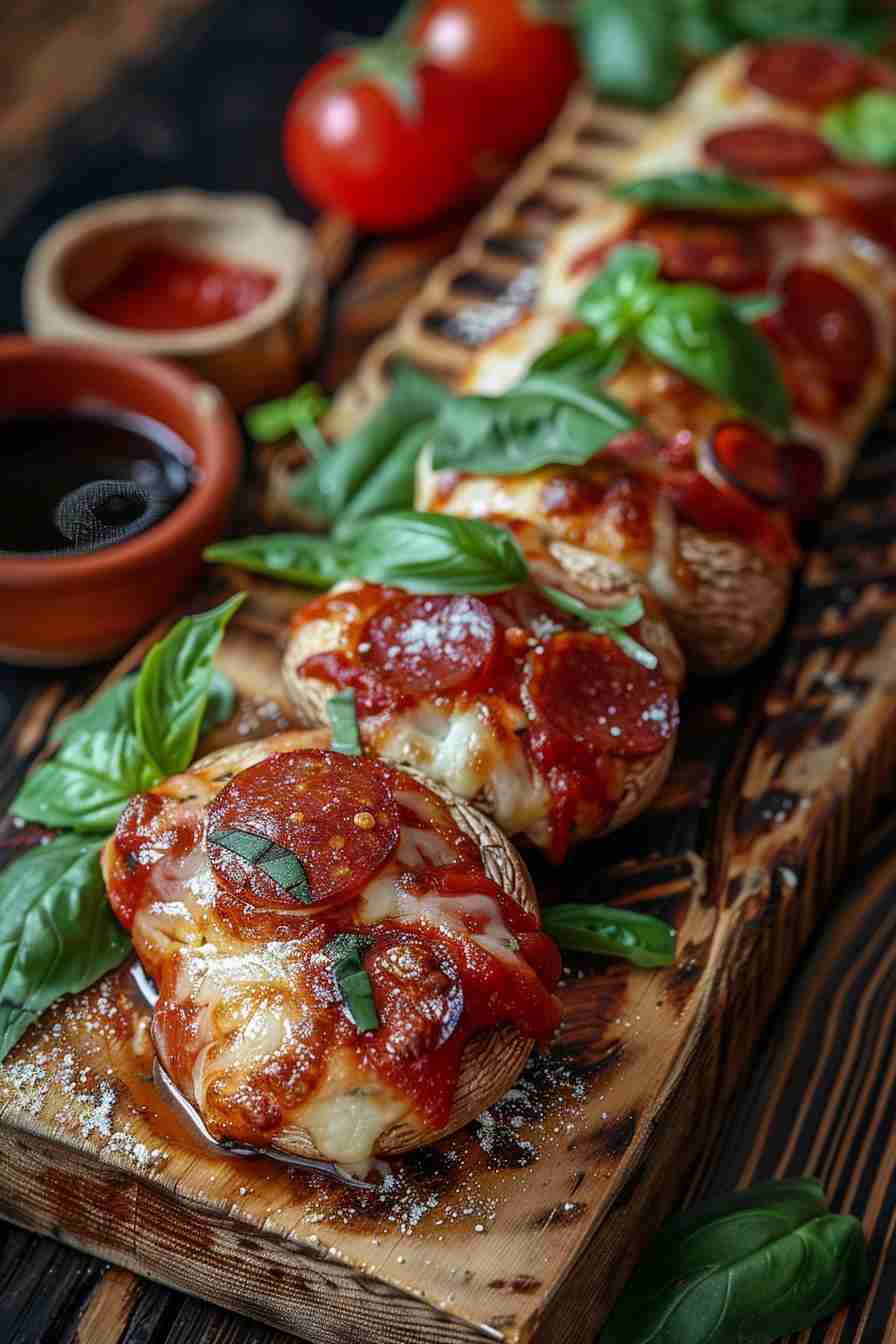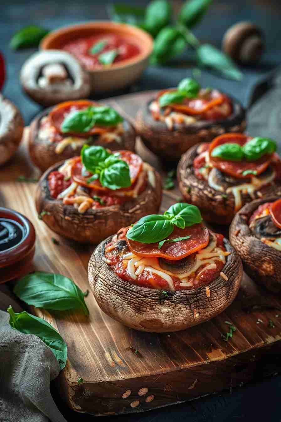Juicy portobello mushrooms overflowing with classic pizza flavors – pepperoni, melty mozzarella, tangy marinara, and Italian herbs.