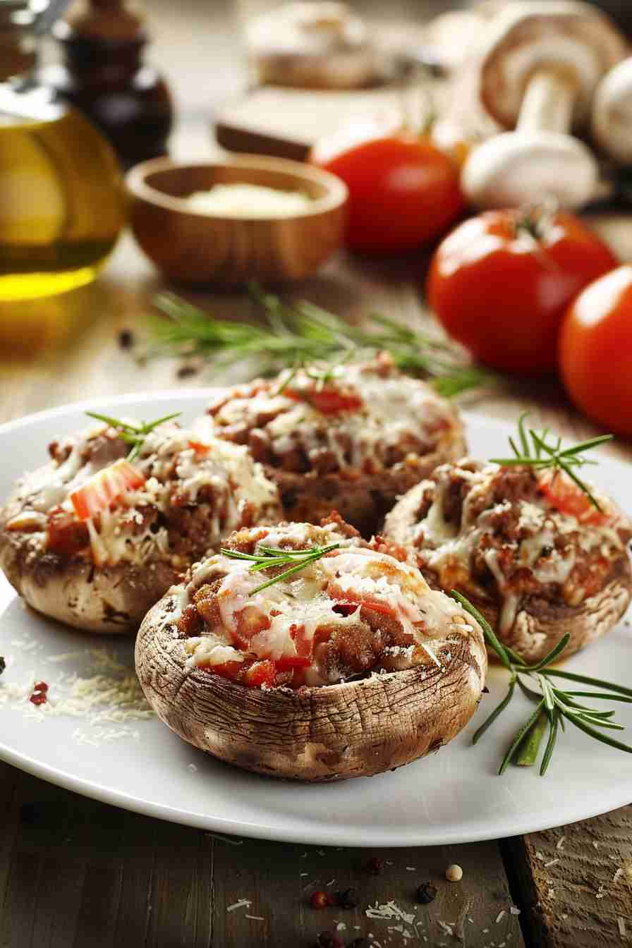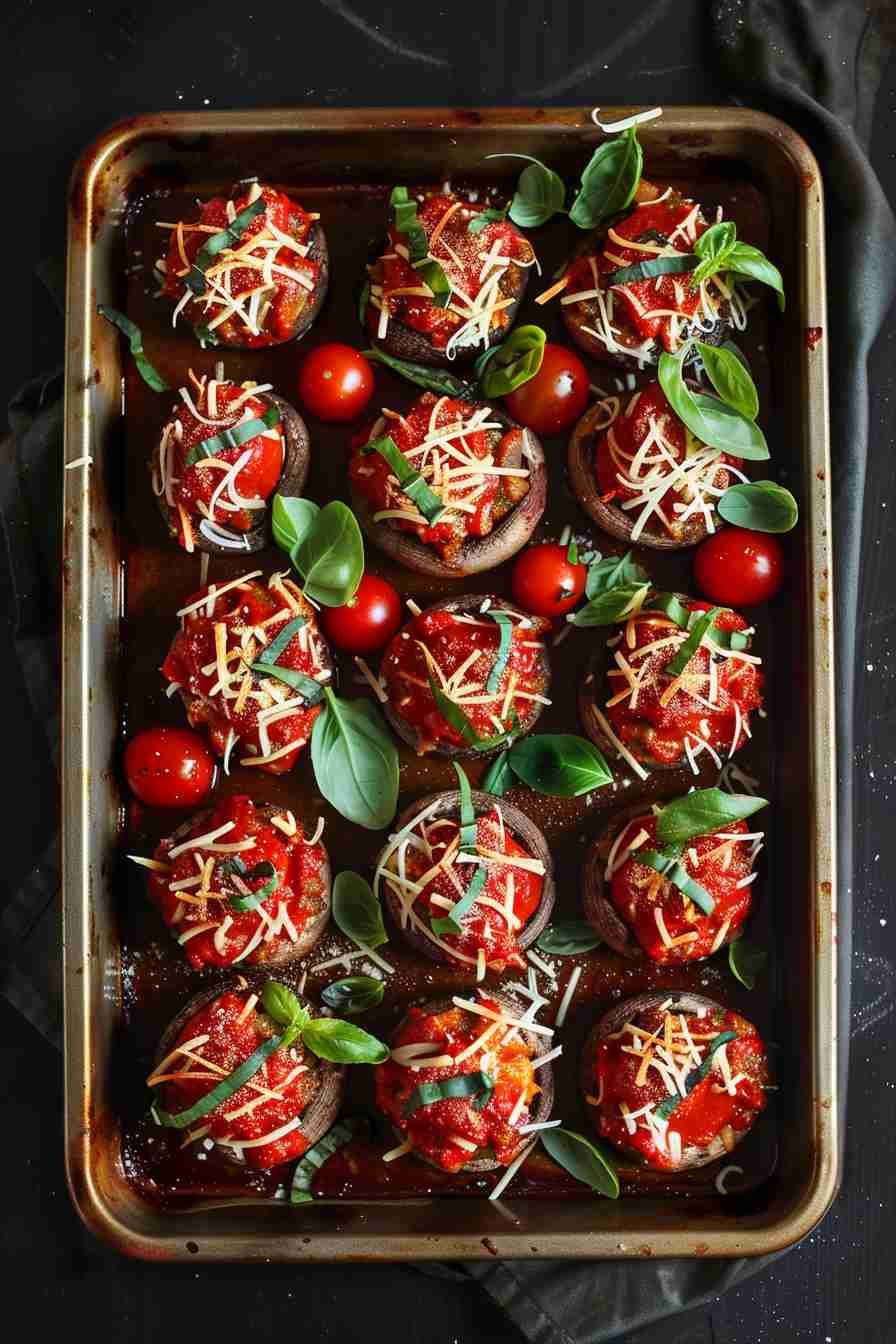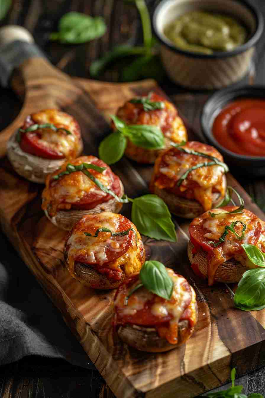 Juicy portobello mushrooms overflowing with classic pizza flavors – pepperoni, melty mozzarella, tangy marinara, and Italian herbs.