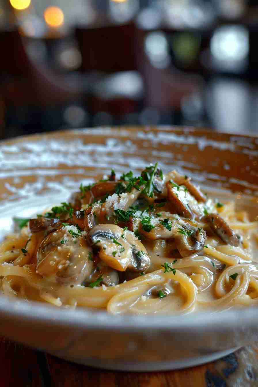 Silky linguine tossed with golden mushrooms, browned butter, garlic, bright lemon, white wine, and a blizzard of Parmesan.