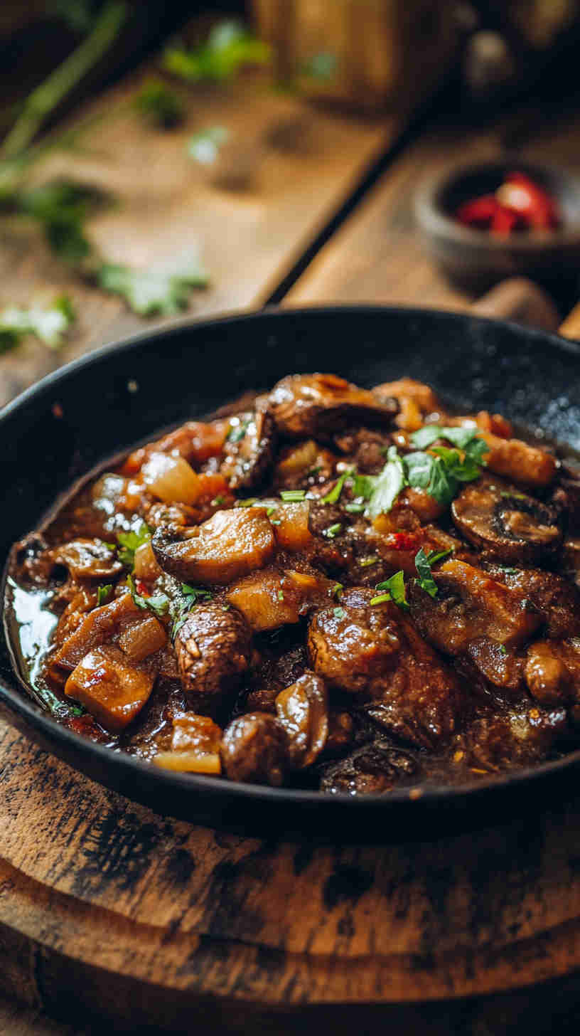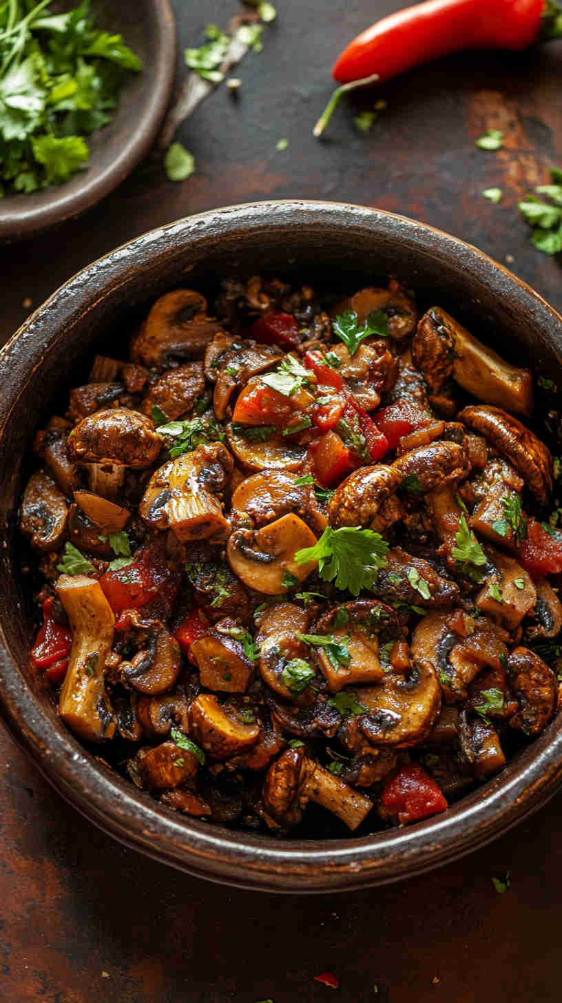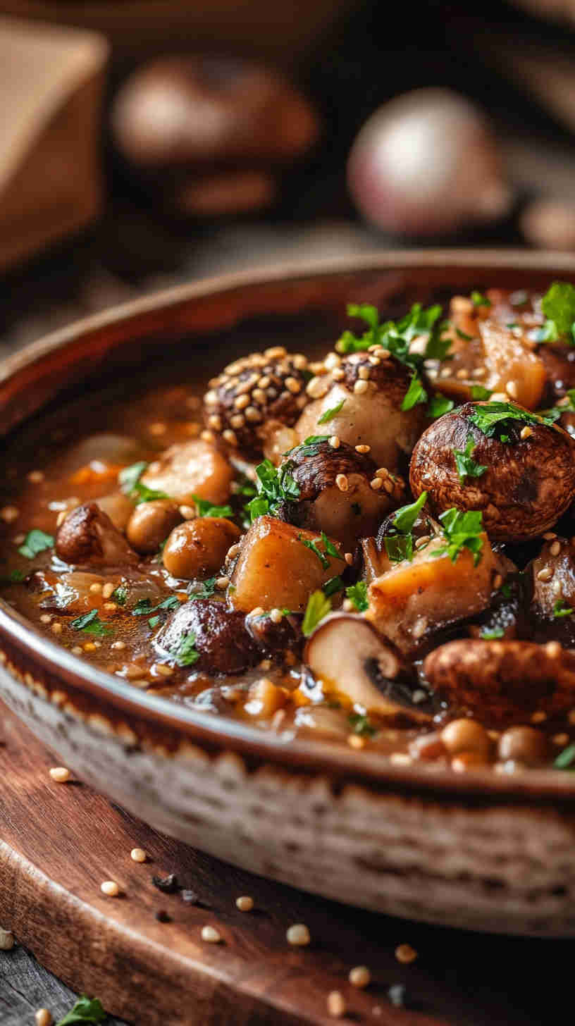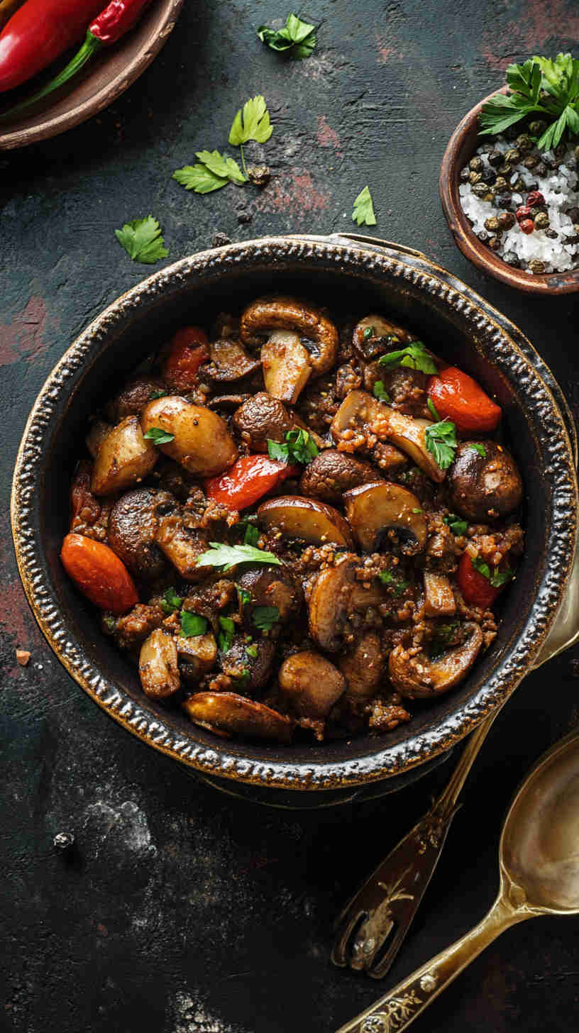 This creative twist on Libya’s iconic Bazeen transforms the traditional barley dough and rich tomato stew into a hearty vegetarian delight. Earthy mushrooms replace meat in a spiced sauce with potatoes, eggs, and aromatic North African flavors, creating a comforting, communal dish perfect for sharing that celebrates African-inspired mushroom cuisine.