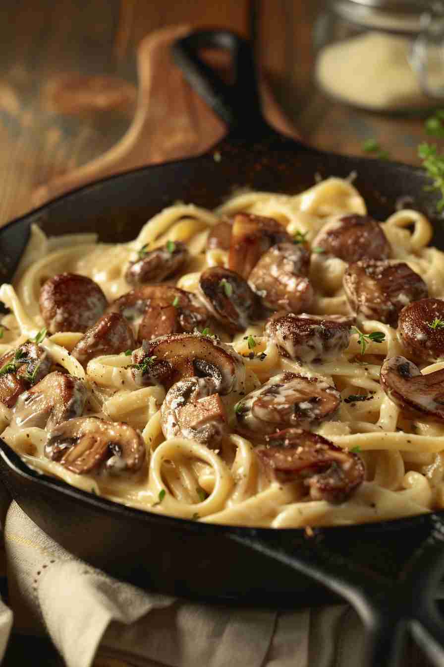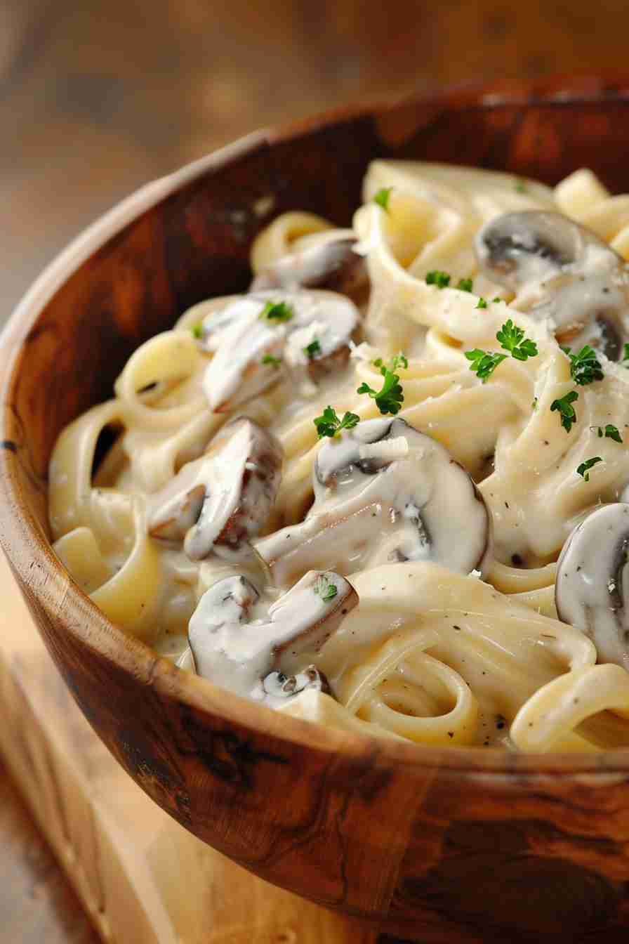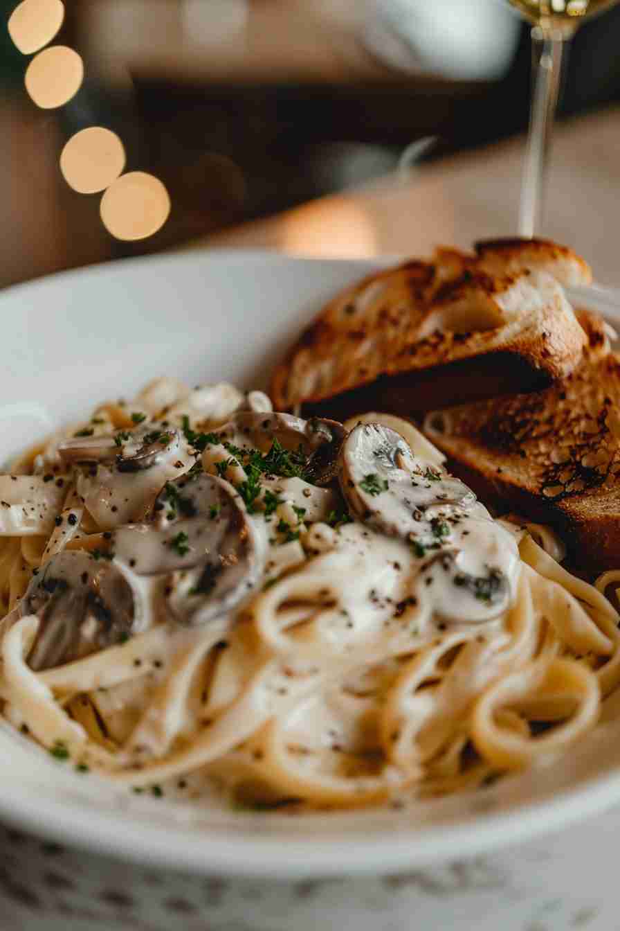 Silky, garlicky mushroom Alfredo with three kinds of cheese, white wine, and golden fettuccine – the creamiest pasta of your dreams.