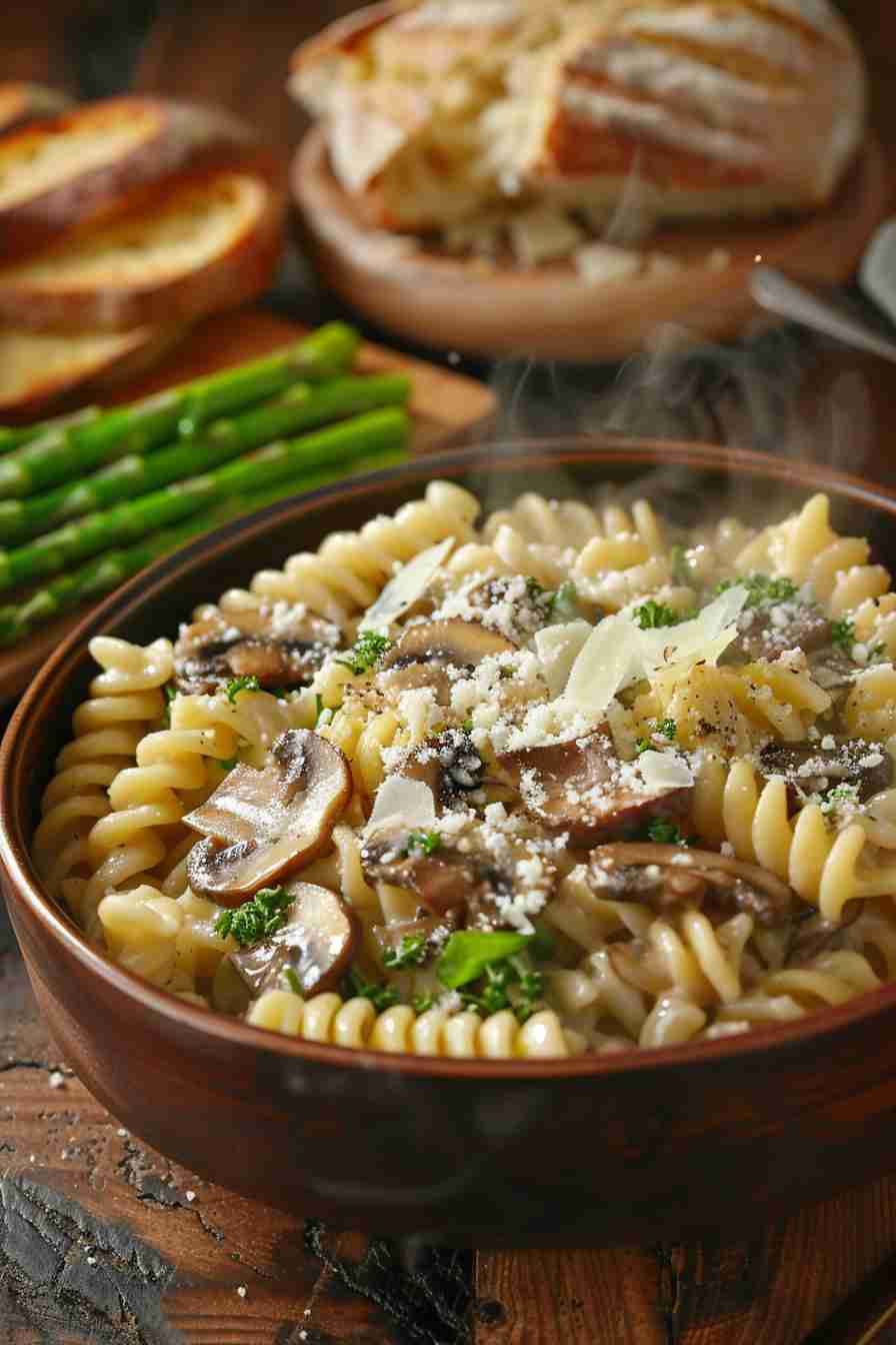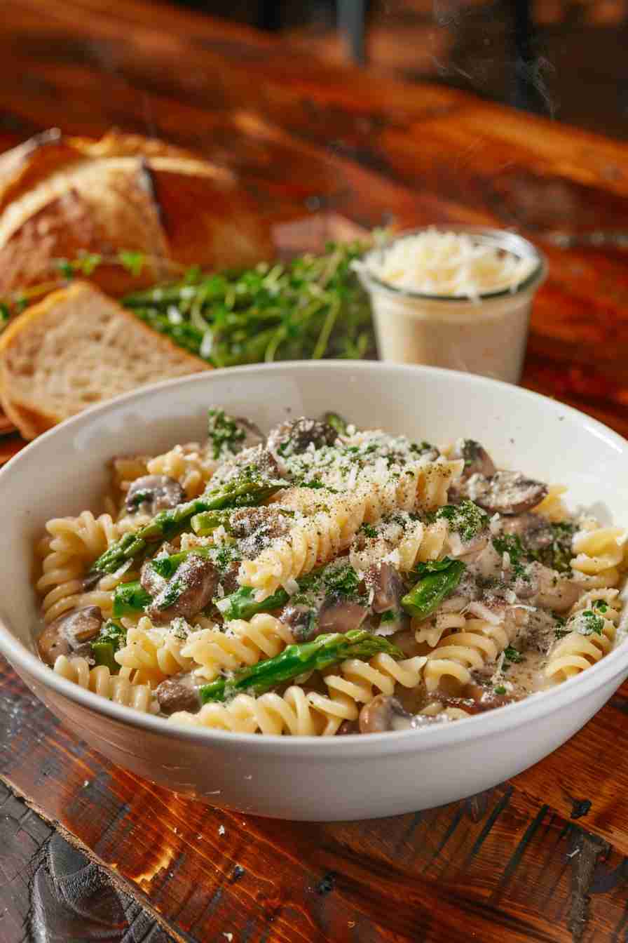 Twirly fusilli with golden cremini, tender asparagus, garlic, lemon, white wine, Parmesan, and fresh herbs – pure spring luxury.