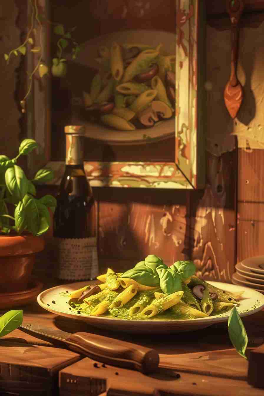 Perfect penne is tossed with butter-browned mushrooms, burst cherry tomatoes, and a vibrant, homemade-style basil pesto enriched with garlic, pine nuts, and Parmigiano Reggiano. Finished with toasted pine nuts, fresh basil ribbons, and cracked pepper, this is the fastest way to pesto perfection that tastes like an Italian holiday.