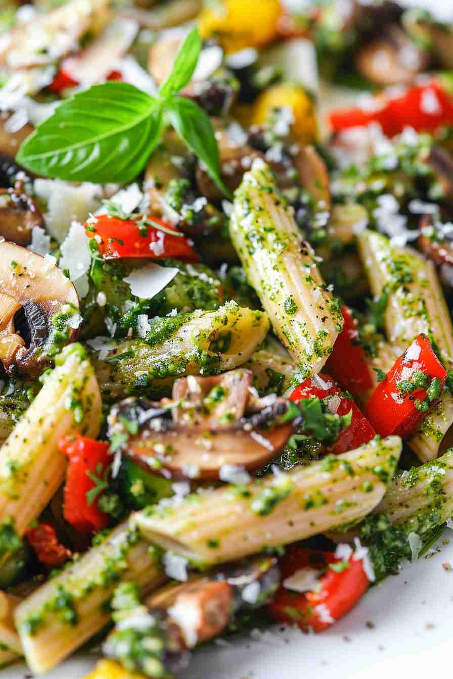 This is the pesto pasta you’ll make every week from May to September. The mushrooms are nutty and golden, the tomatoes collapse into sweet-tart sauce, the pesto is bright and garlicky, and the bronze-die penne grabs every drop like it was designed for this dish. It’s ready in 20 real minutes, vegetarian (easily vegan), naturally gluten-free adaptable, and tastes like something from a cliff-side restaurant in Liguria. One bowl and you’ll be licking the pan clean.