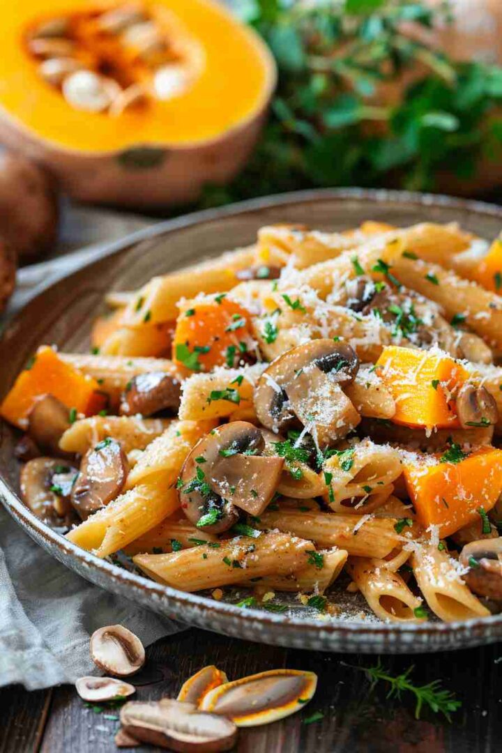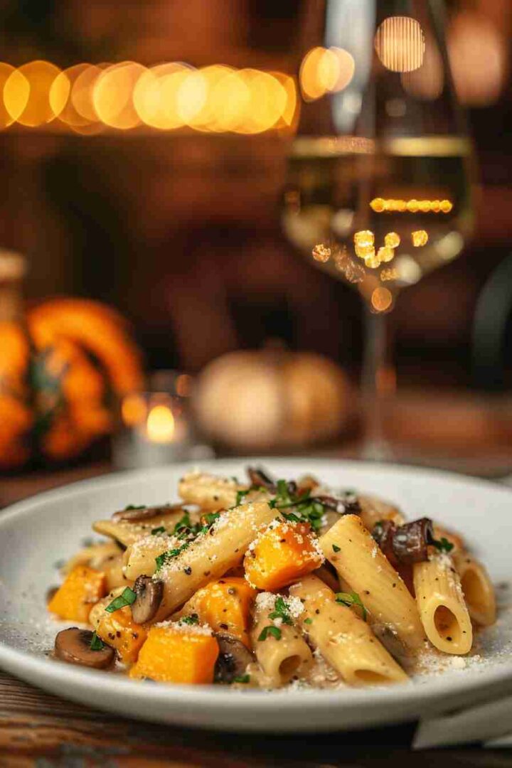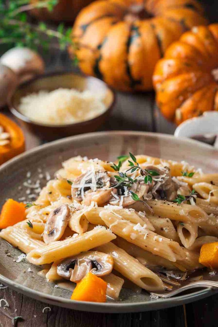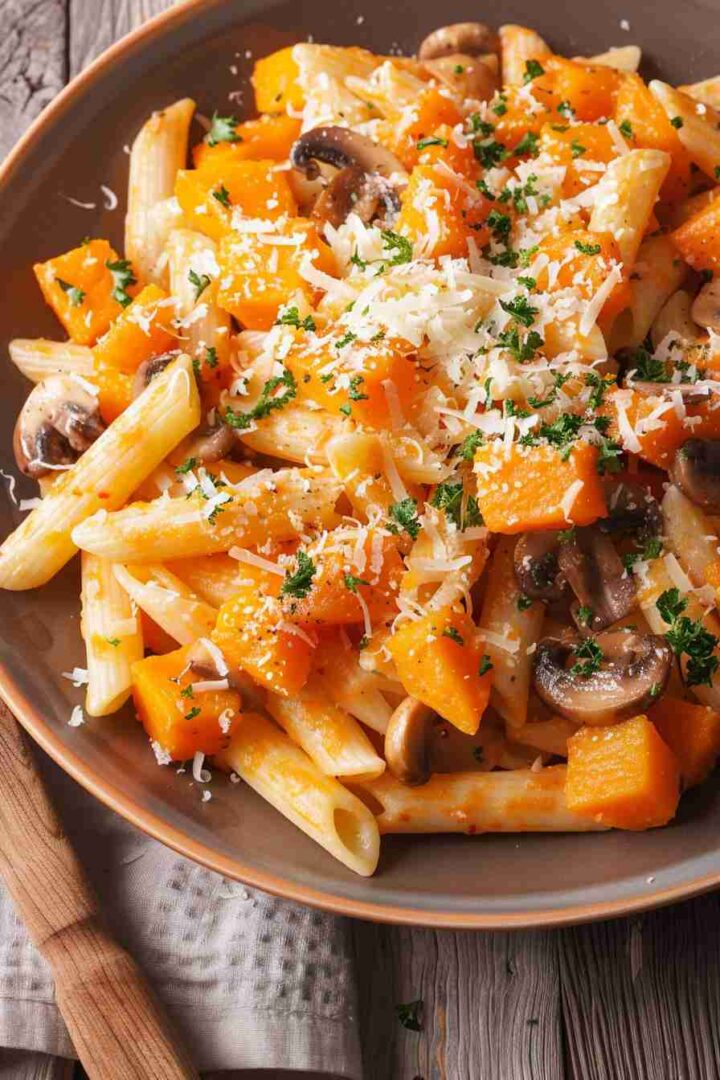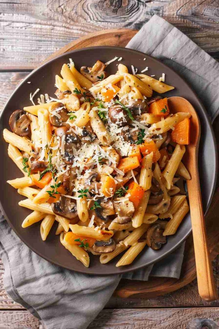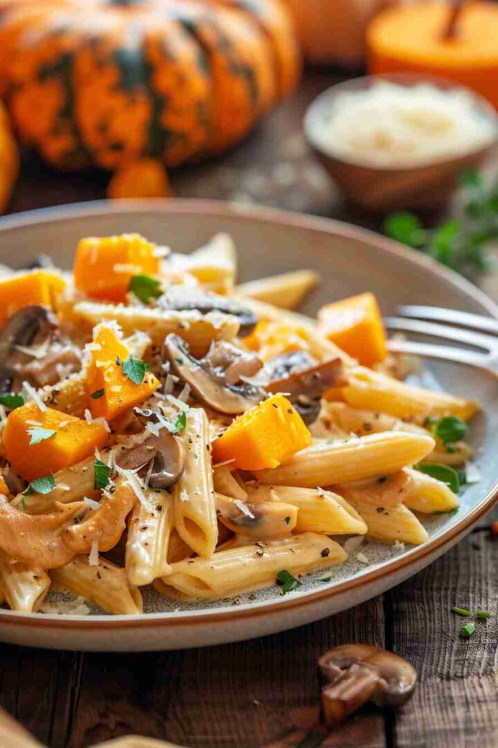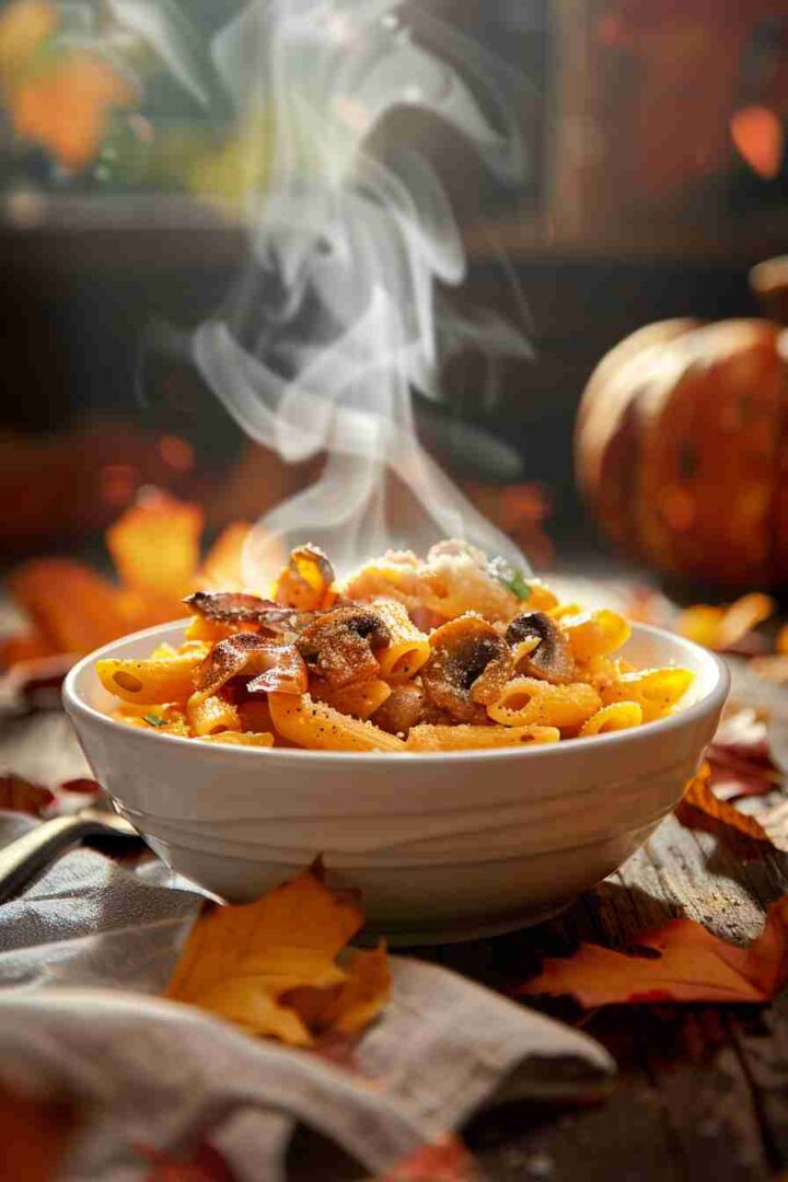 This luxurious autumn pasta combines deeply caramelized roasted pumpkin purée with browned butter, crispy sage, garlic, white wine, and a triple-cheese cream sauce, tossed with perfectly al dente penne and nutty wild mushrooms. Finished with toasted hazelnuts and cracked pepper, it’s cozy elegance in every single time.