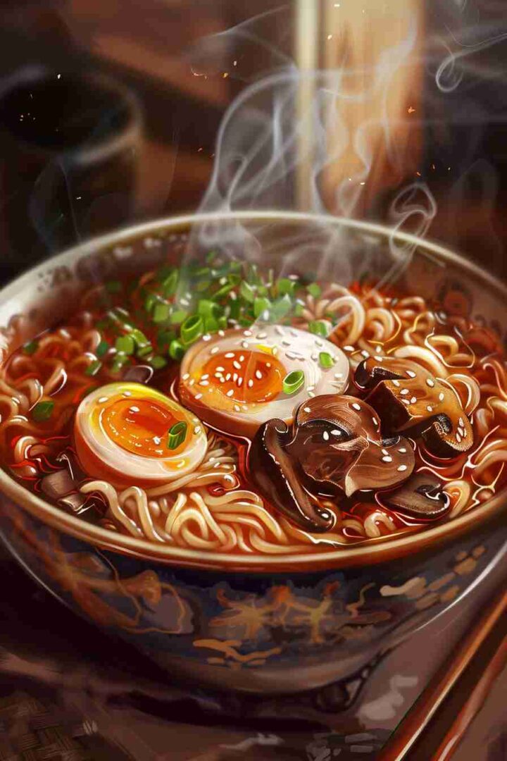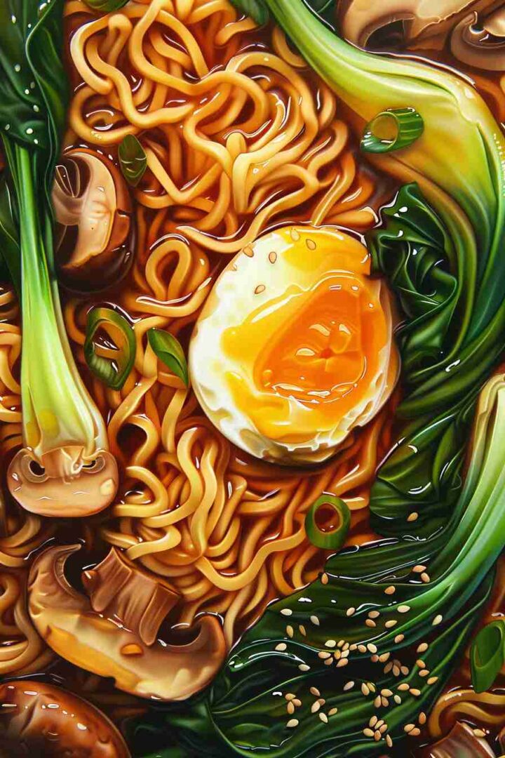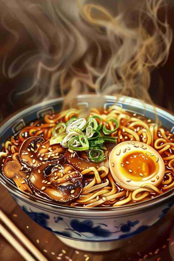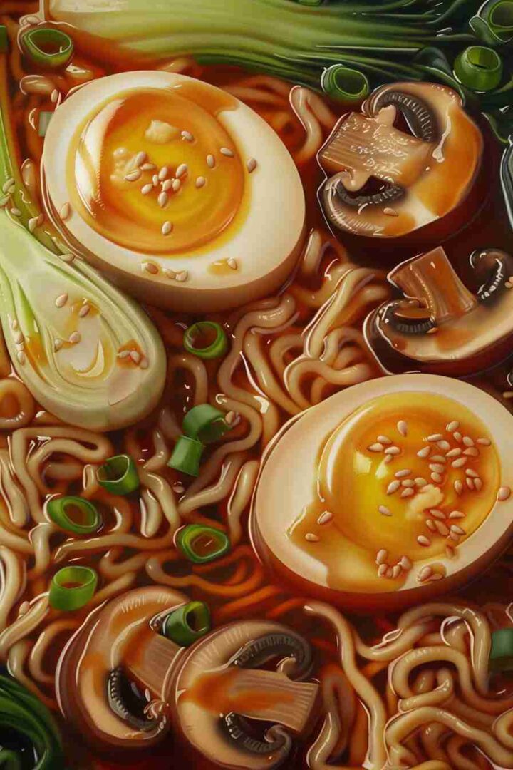 - Divide noodles among warm bowls. Ladle piping-hot broth over. Arrange king oyster “scallops,” enoki clusters, halved jammy egg, nori quarter.