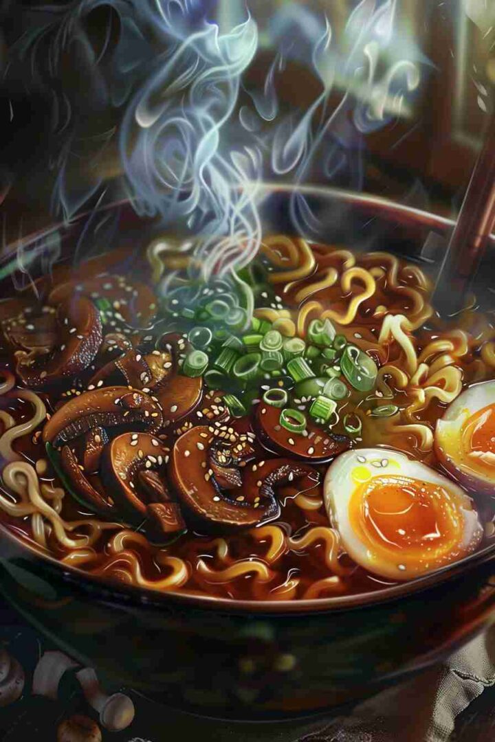 This soul-warming bowl features an intensely savory mushroom-shiitake-kombu broth enriched with miso butter, garlic, and ginger, served with bouncy fresh ramen noodles, pan-seared king oyster “scallops,” enoki clusters, soft-boiled egg, scallions, nori, and togarashi. It’s 100 % vegan-adaptable yet tastes like it simmered for 12 hours.