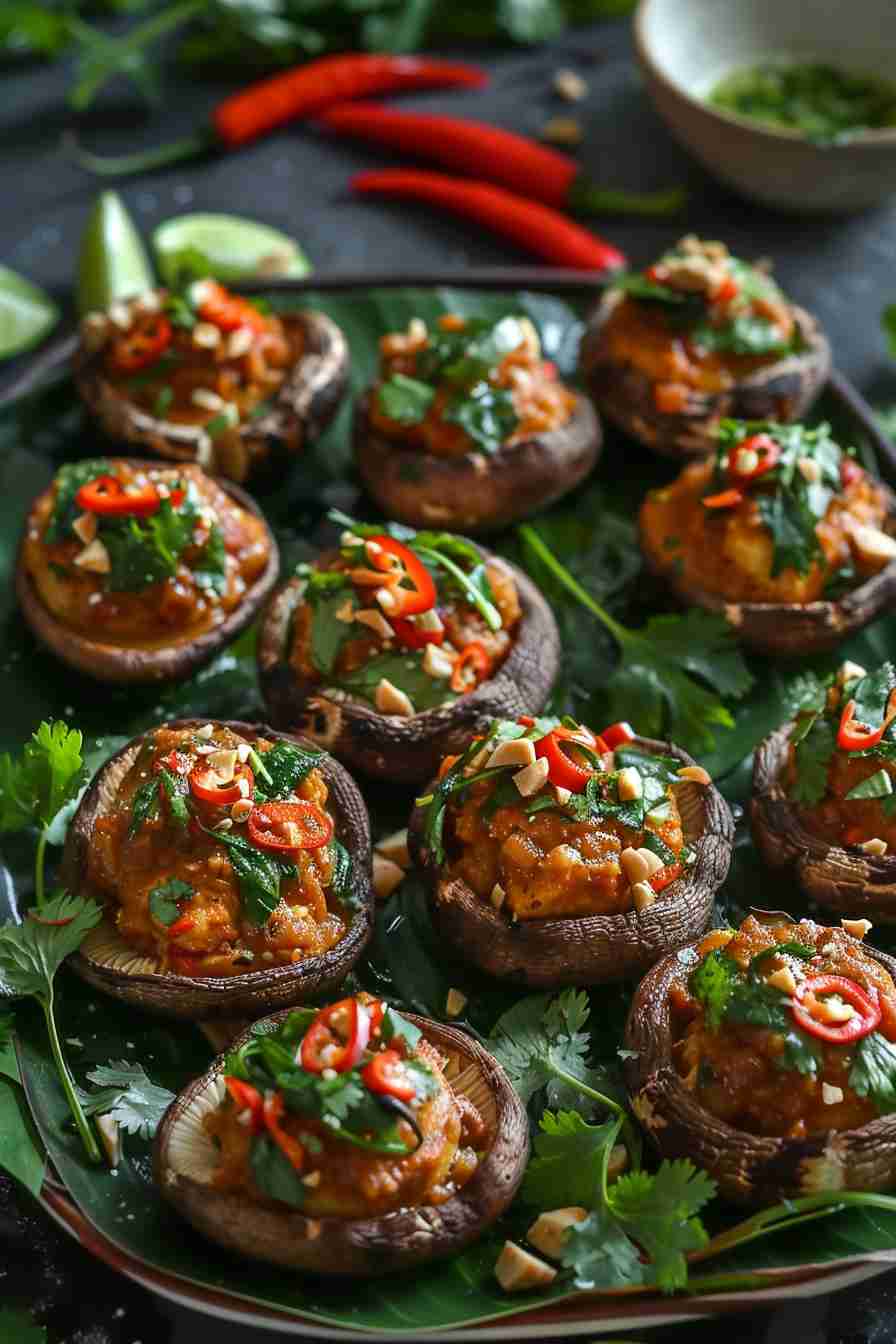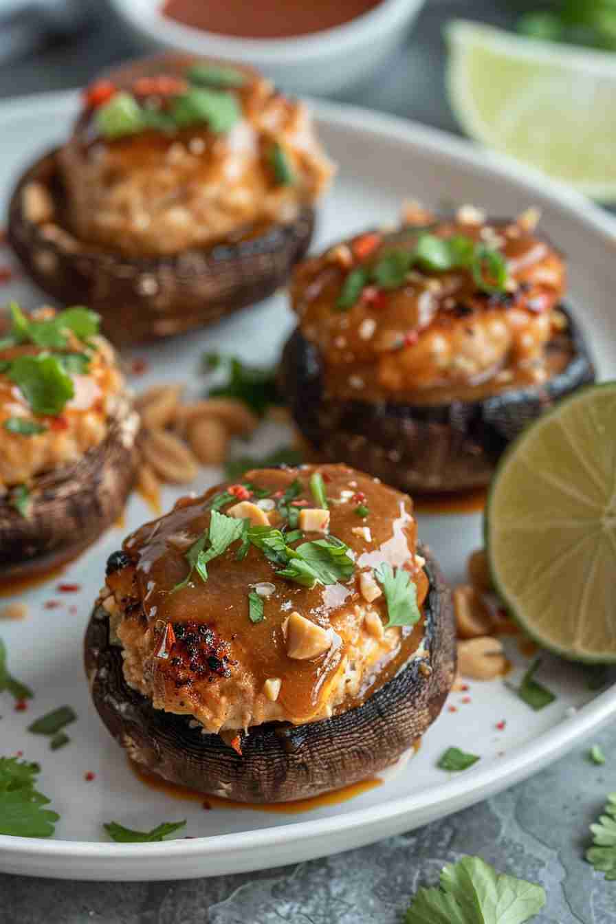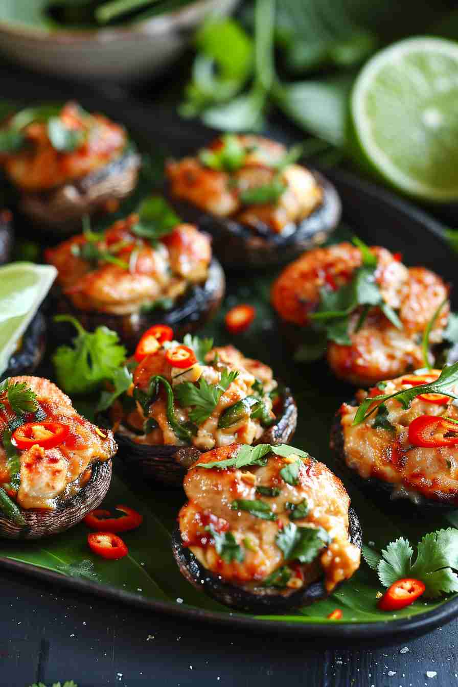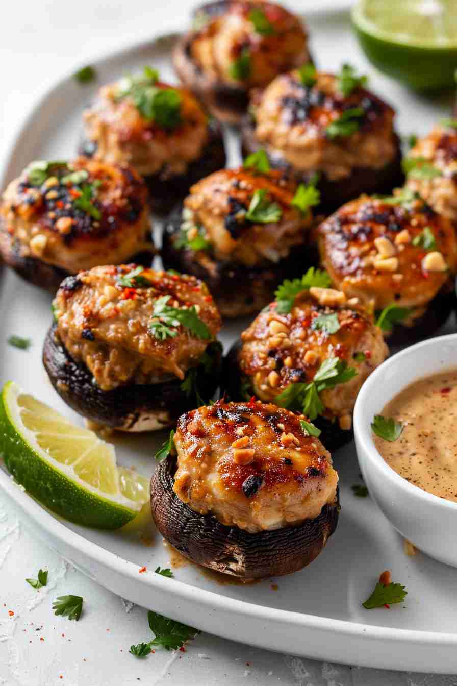 Tender mushrooms stuffed with creamy Thai peanut chicken, lime, cilantro & crushed peanuts – bold, addictive Asian flavors!