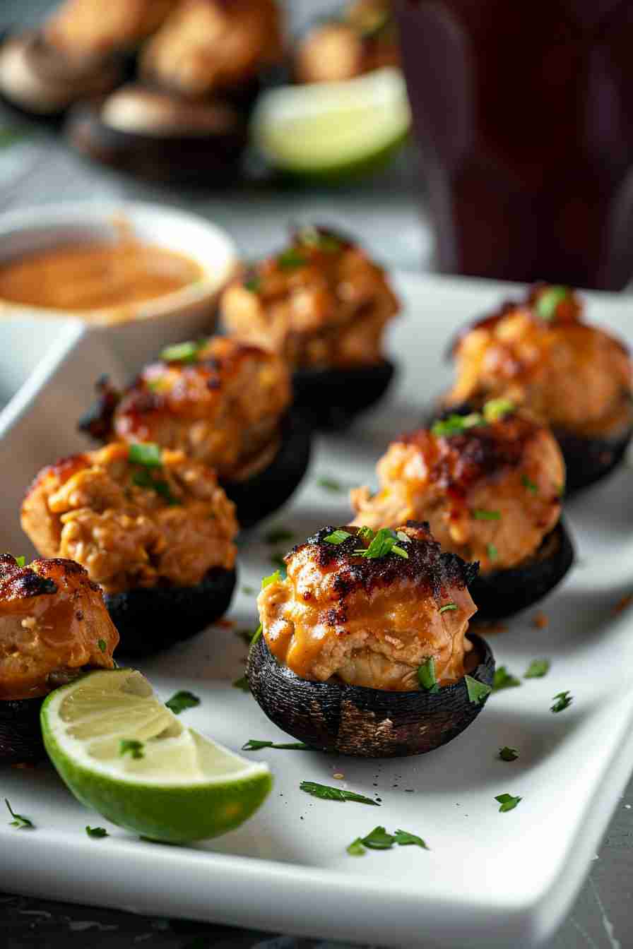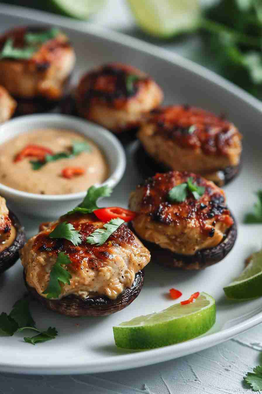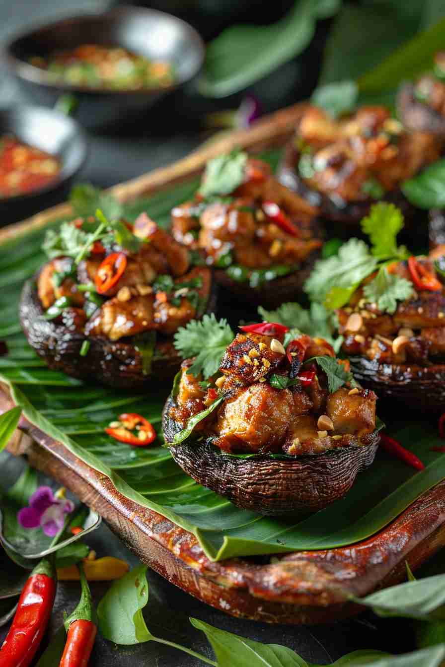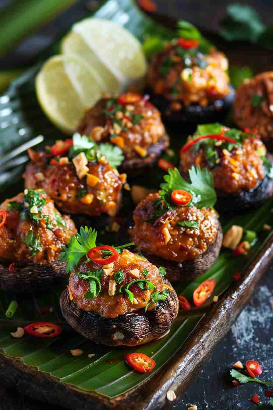 Tender mushrooms stuffed with creamy Thai peanut chicken, lime, cilantro & crushed peanuts – bold, addictive Asian flavors!