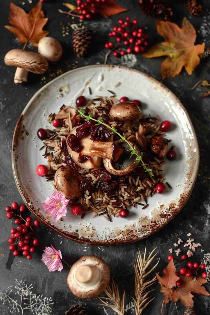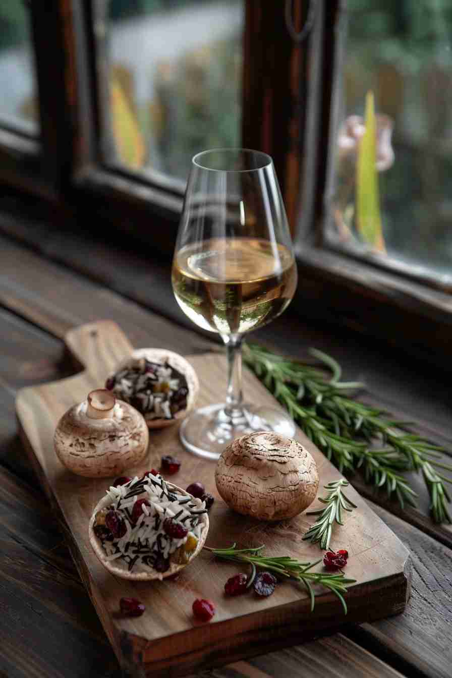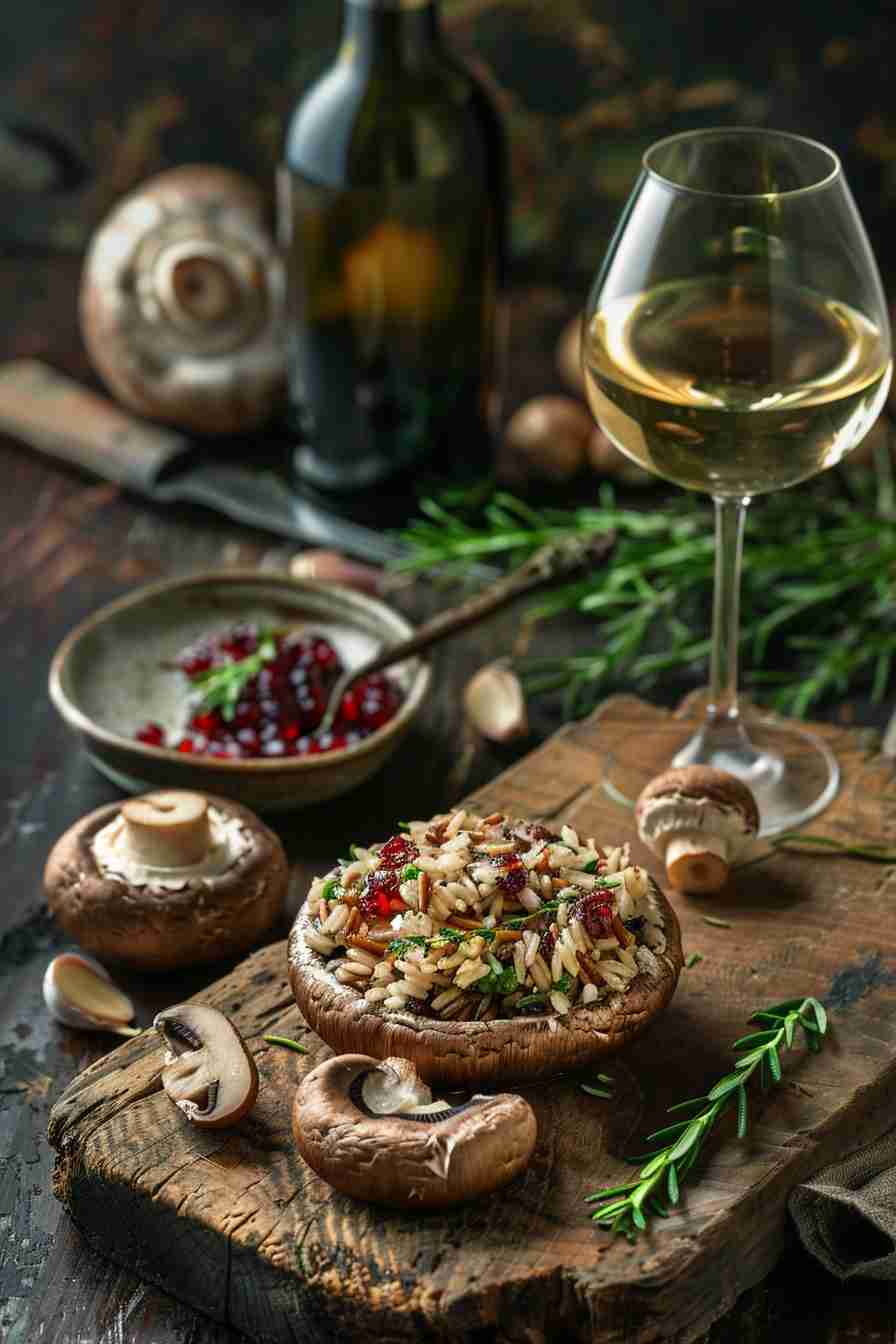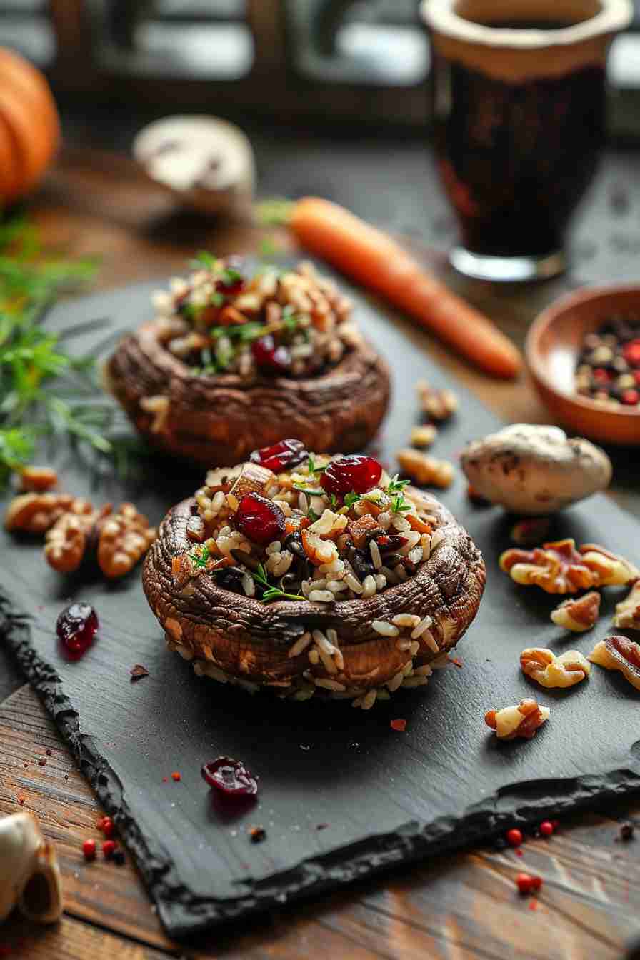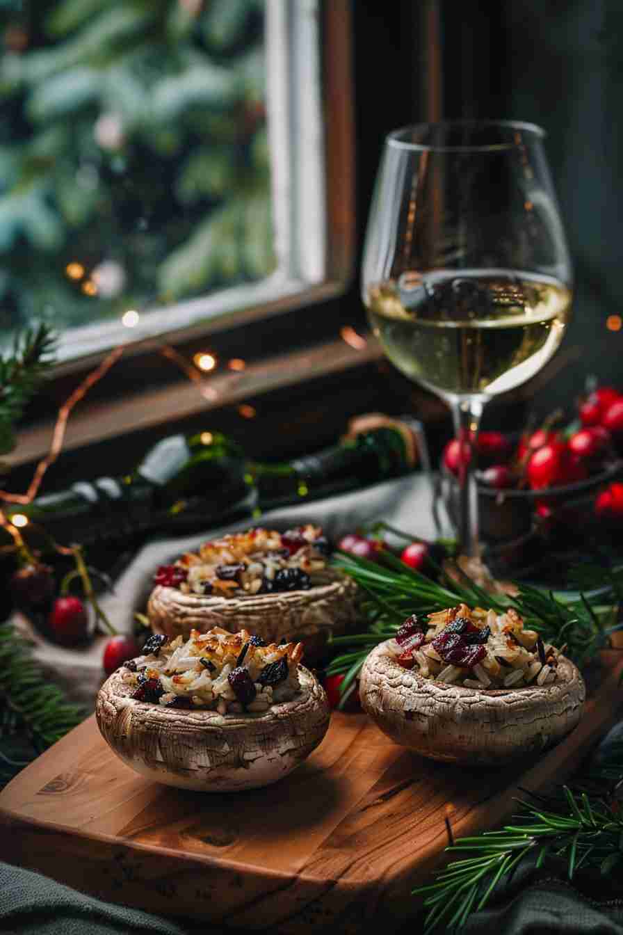 Earthy mushrooms filled with nutty wild rice, sweet-tart cranberries, sage, and pecans – perfect elegant holiday or autumn appetizer!